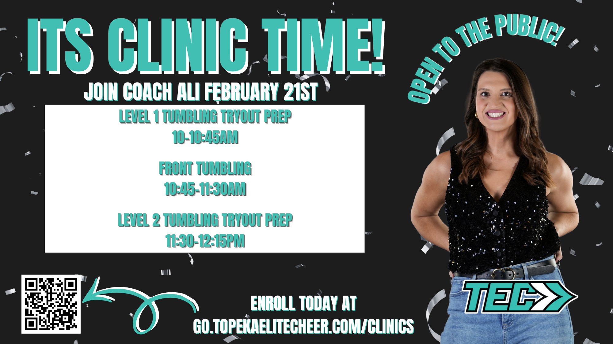Open Tumbling Clinic You pick the skill — we bring the drills and spotting! Our Open Tumbling Clinic is a focused, small-group session designed to give athletes individualized attention on the skills they want to work. Athletes of all levels are welcome, from beginners building confidence to elite tumblers dialing in higher-level skills. Coaches will...